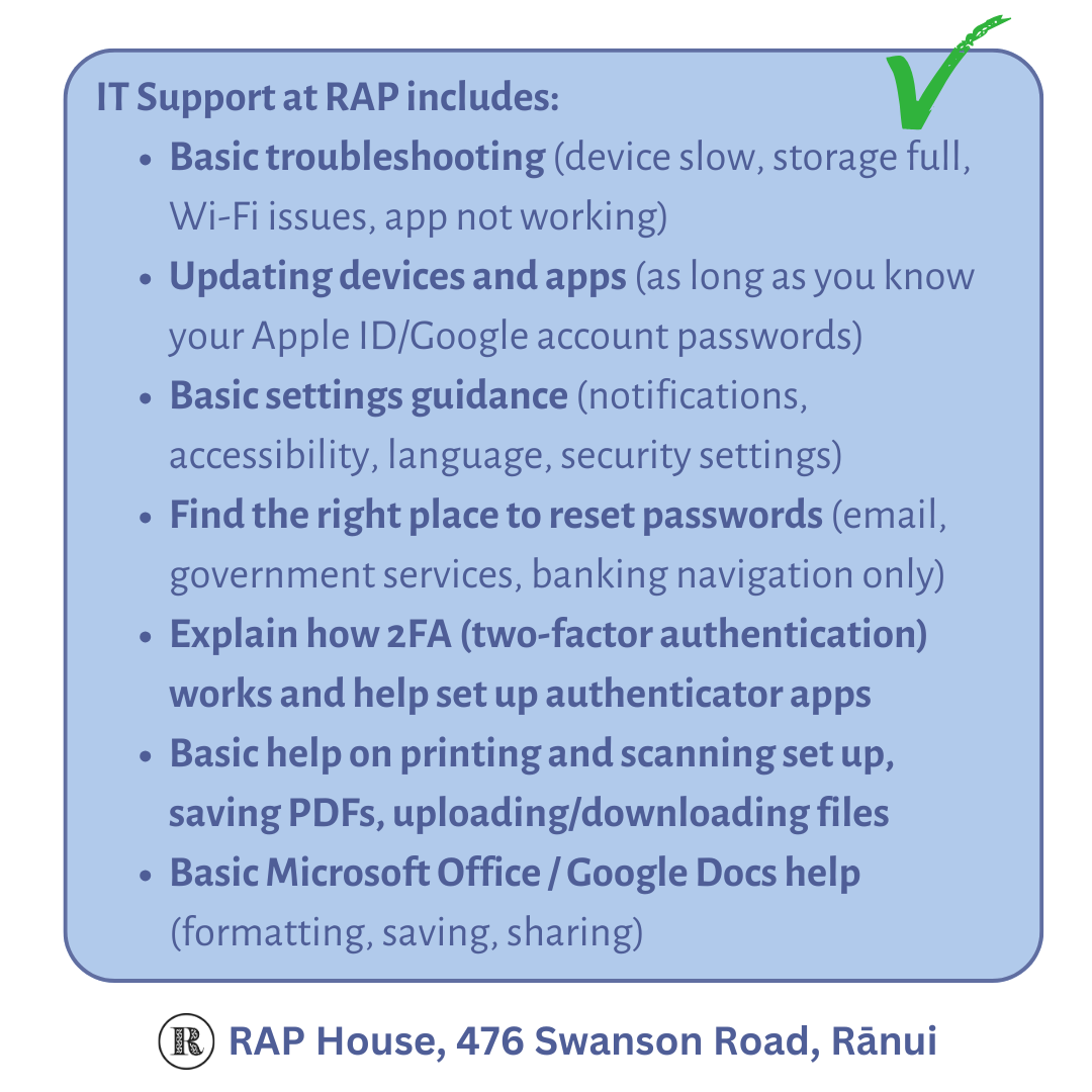 You can drop in for our IT / Computer sessions on Fridays at RAP house from 12.00pm to 2.00pm.
